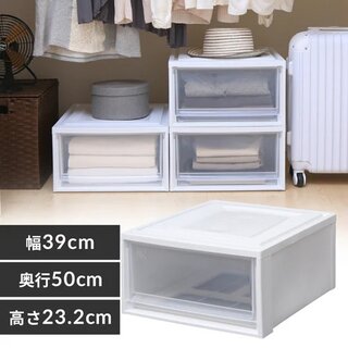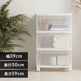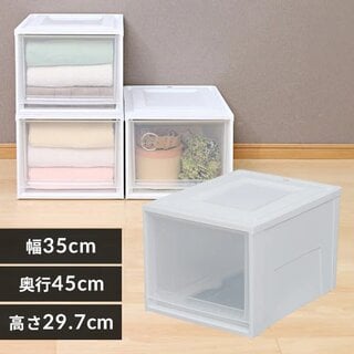 衣類収納に便利な、シンプルで使いやすいチェストです。中身が見えるクリアタイプなので、収納物がひと目で分かり、さまざまなシーンで活躍します。重ねた状態でも安定して使えるよう、天面には前倒れを防ぐ加工を施しています。
