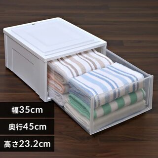 一般的なクローゼットにちょうど良い奥行き50cmのチェストです。浅型でも27.7Lとたっぷり収納できます。ひっかけて固定する前倒れ防止構造で、重ねても引き出し時に倒れにくくなっています。デッドスペースの有効活用にも役立ちます。