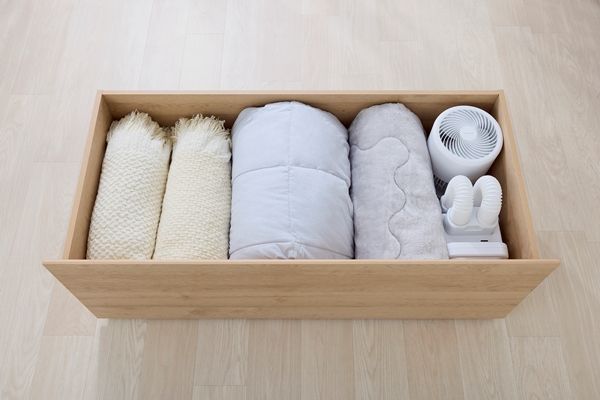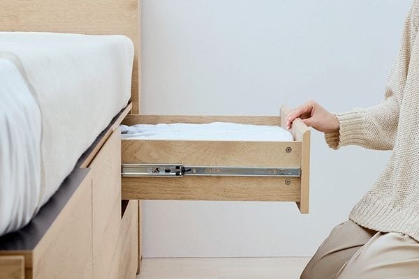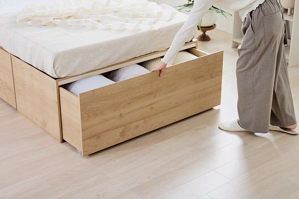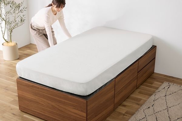 たっぷり収納できて生活感も隠せる超収納ベッドです。フット部はワイドサイズの引き出しを設け、布団などの容量物も収納可能です。
