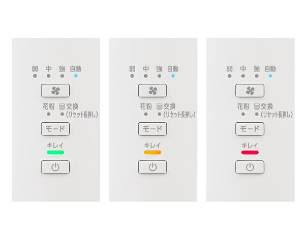 | 風量(50/60Hz) | ・加湿空気清浄機:弱 0.2m³/分/0.2m³/分、中 0.5m³/分/0.4m³/分、強 1.5m³/分/1.5m³/分 ・空気清浄機:弱 0.5m³/分/0.4m³/分、中 1.4m³/分/1.3m³/分、強 3.1m³/分/2.9m³/分 | 消費電力(50/60Hz) | ・加湿空気清浄機:弱 6W/7W、中 18W/21W、強 44W/45W ・空気清浄機:弱 6W/7W、中 18W/21W、強 44W/55W |