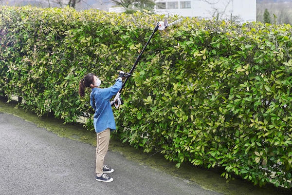 伸縮式ポールで高所の剪定もラクにできる、充電式ポールヘッジトリマーです。