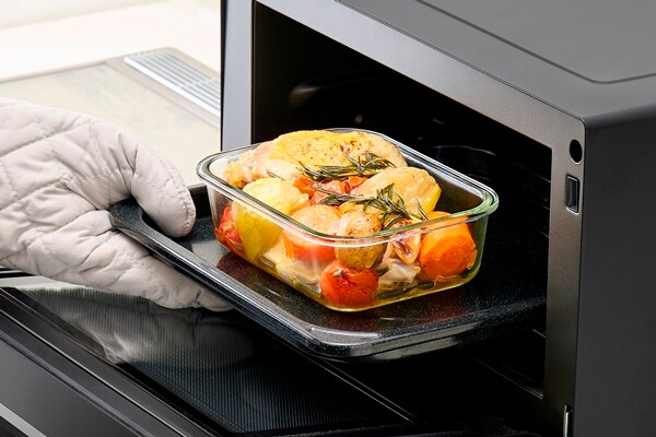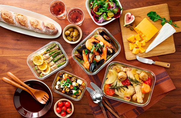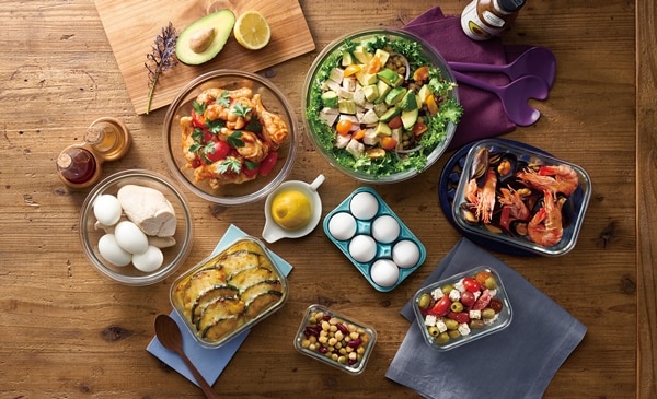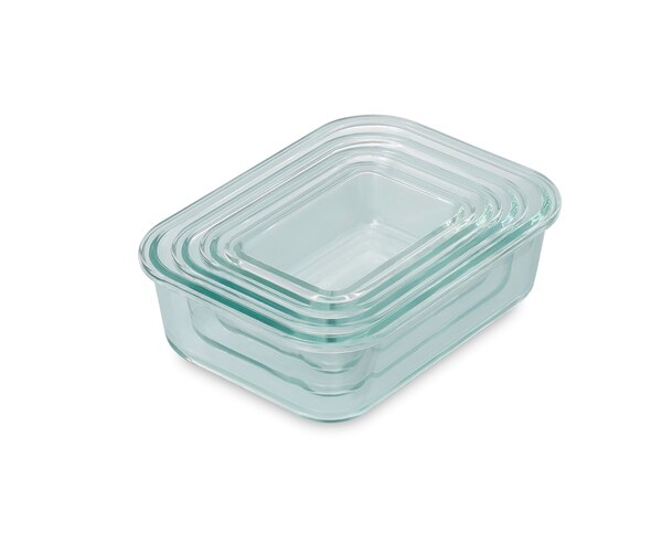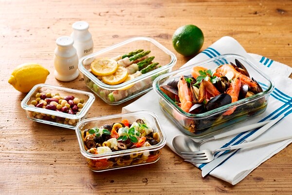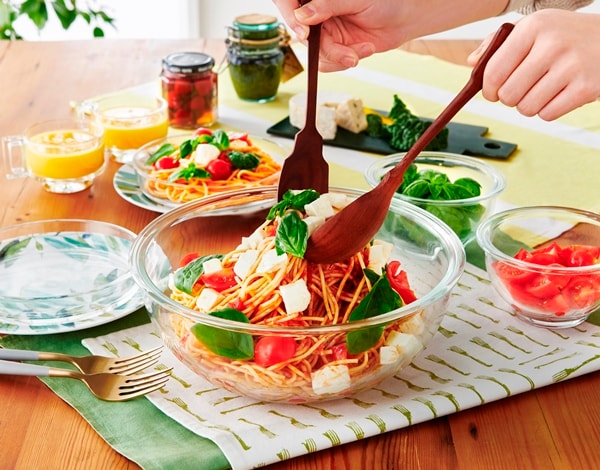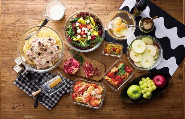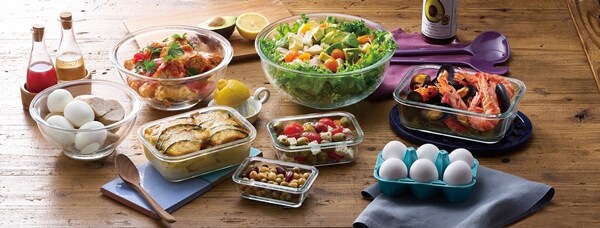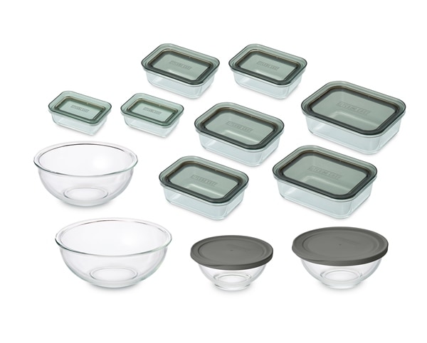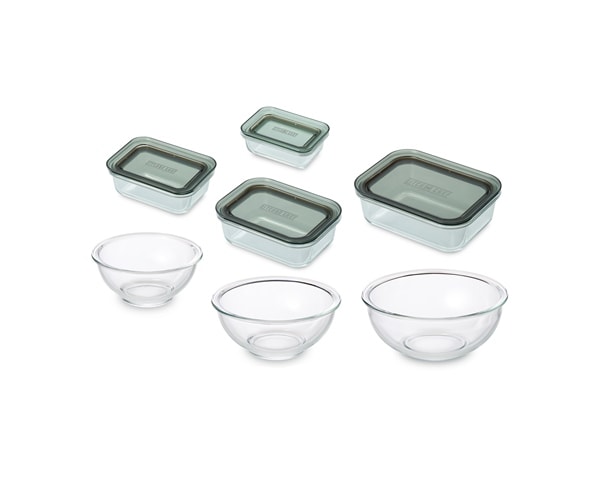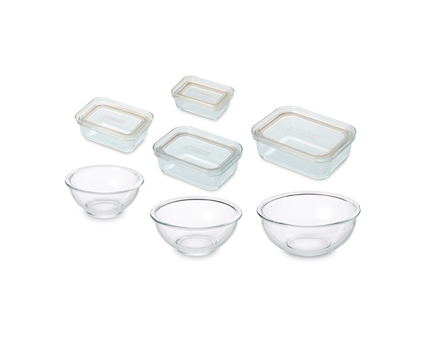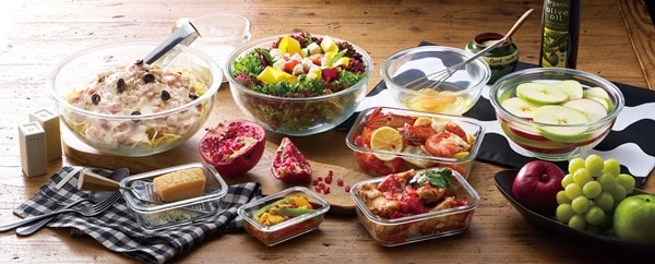 電子レンジやオーブンで使用できる耐熱ガラス容器とボウルのセットです。