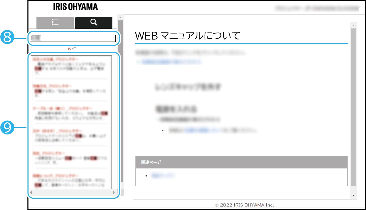 選択すると、WEBサイトやWEBマニュアル内の該当ページが表示されます。