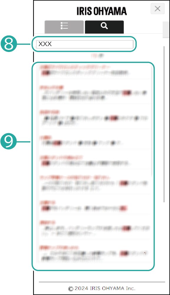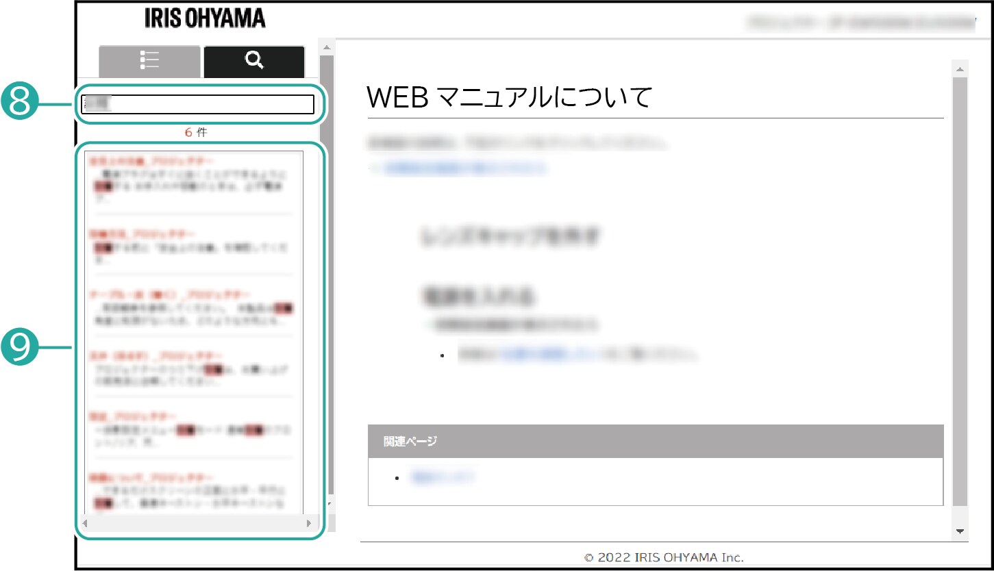 選択すると、WEBサイトやWEBマニュアル内の該当ページが表示されます。