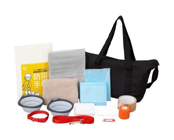 | セット内容 | ショルダーバッグ1個、ディッシュ2枚、折りたたみトイレ1個、ペットシーツ10枚、防臭袋20枚、迷子札1個、リード1本、首輪1本、自着性テープ1本、タオル1枚、ハンカチ(ガーゼ素材)1枚、アルミシート1枚、おそうじシート10枚、テープ1本、防災手帳1冊 | 追加で備えておきたいもの | ペットフード、水、薬、排泄物の処理用具、ブラシ、キャリーバッグやケージ、清浄綿、お気に入りのおもちゃ、油性ペンなど |
