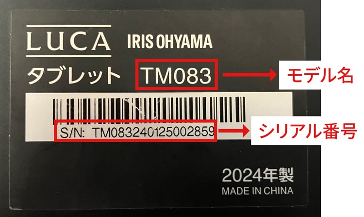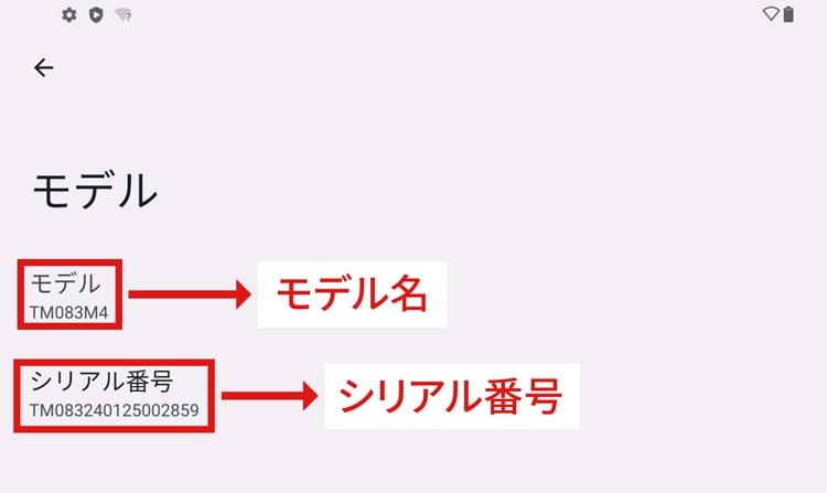 ・タブレット内の「設定」→「タブレット情報」→「モデル」の順にタップしてもご確認いただけます。