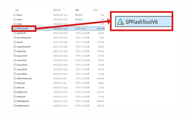 展開したフォルダ内のSPFlashToolV6.exe をダブルクリックして実行します。