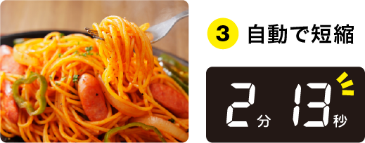 ※当社比。市販の冷凍唐揚げ(レンジ500W/8分00秒)と、冷食時短ブースト機能使用時の加熱時間5分46秒との比較。